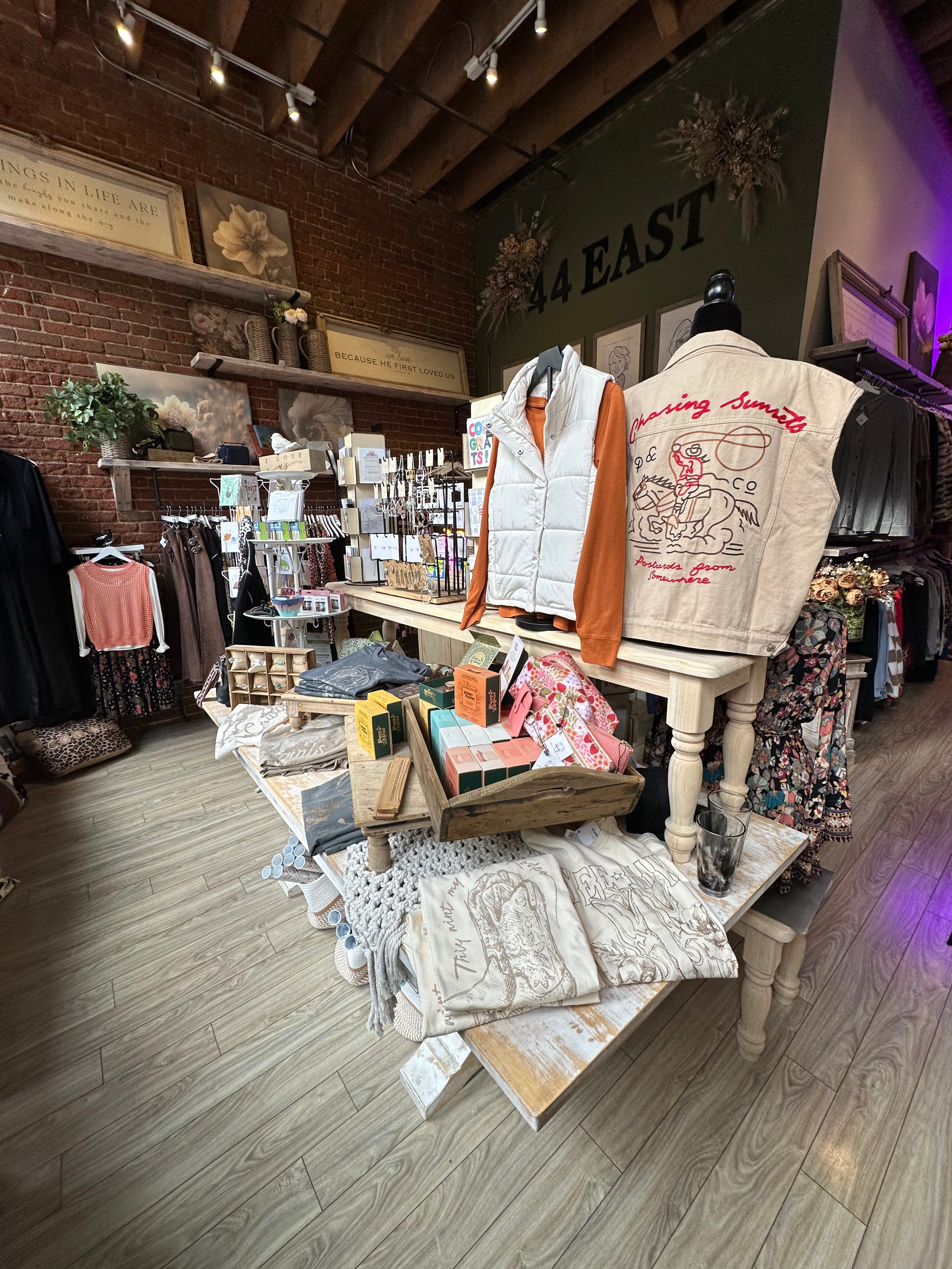 At 44 East, we’ve carefully curated a collection of fashion, comfort, accessory, and gift to inspire confidence and joy. Whether you’re visiting us in person or discovering our shop online, we want you to feel like a part of our community. If you’re looking for a standout outfit, a thoughtful gift, or a little everyday sparkle, we’re here to help you find something you love.